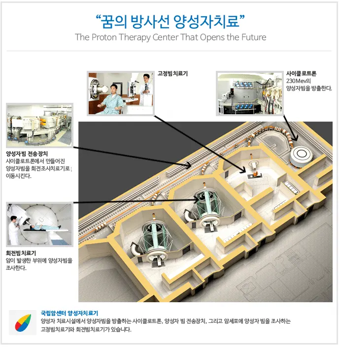 - 양성자를 원통형 가속장치인 사이클로트론(Cyclotron)에서 빛 속도의 60% (1초에 지구를 4.5번 돌 수 있는 속도) 수준으로 가속해 암 치료에 활용하는 방식